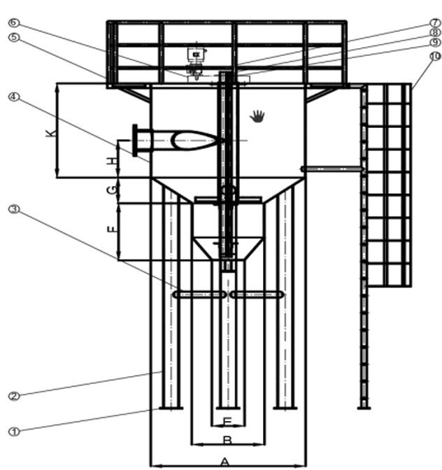 1、底板;2、鋼管牛腿;3、牛腿加強管;4、沉砂池本體;5、走道平臺及欄桿;6、驅動機構;7、提砂管;8、氣沖管;9、氣提管;10、爬梯