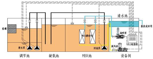 主要包括以下五大單元: (1) 調(diào)節(jié)池、(2) 缺氧池、(3) MBR池、(4) 設(shè)備間、(5) 清水池