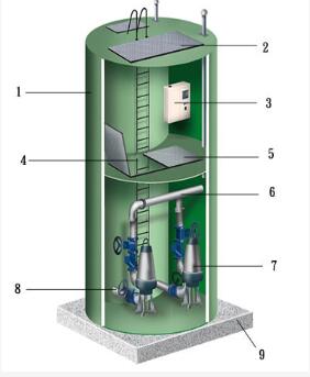 (1)一體化污水泵站的筒體采用玻璃鋼制作而成。 (2)組裝好的潛水排污泵(包括泵殼,葉輪,電機,機械密封件,泵軸等) (3)自動連接裝置和底座 (4)提升裝置(導軌系統和支架等) (5)壓力管道系統和閥門 (6)靜壓液位計和智能控制柜; (7)連接配件和所有用于安裝的緊固件;