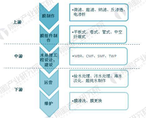 圖表1:中國膜工業發展歷程 膜工業產業鏈介紹 膜工業產業鏈自上而下包括:膜材料制造、膜組件制作、水處理工程建設、水處理設施運營維護。 上游膜材料的性能和價格直接影響膜組器設備的性能、膜法水處理工藝的優化空間和水處理設施的投資成本與運營費用,因此該行業成熟的經營模式是向融膜材料研發生產、膜組器設備制造和工程化實施為一體的方向發展。