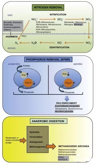 在人類漫長的歷史長河中,水可利用性發揮著至關重要的作用。隨著人口增長和經濟社會活動的增加,全球需水量也在持續上升,而隨之帶來的水污染也越加嚴重。這在很大程度上促進了污水處理工藝的發展,其中生物污水處理系統,利用微生物特性降解有機質、去除營養物質,把有毒物質轉化為無毒物質,在污水處理中扮演著重要角色。 然微生物在污水處理過程中如此重要,那微生物在污水處理過程中到底是如何發揮作用的既呢?污水處理過程中的微生物又該如何研究呢? 污水處理中微生物的研究方法 分子生物學方法如PCR技術的革新,徹底改變了污水處理過程中微生物研究的現狀。“組學時代”到來,對污水處理系統中微生物系統發育和功能多樣性的研究帶來了轉折(圖1)。高通量測序技術的發展,極大地降低了測序成本。除了分離微生物的全基因組測序研究,宏基因組學和宏轉錄組學方法也已經被應用于揭示污水處理系統整體微生物群落基因組潛能和轉錄本信息。 除基于核酸的方法外,宏蛋白組學和宏代謝組學方法(圖1)的出現,推動了污水處理過程中微生物與微生物、微生物與生物大分子互作的研究。 污水處理系統微生物多樣性 利用高通量測序技術揭示對污水處理廠活性污泥的研究揭示,其優勢菌門為變形菌門,而在不同條件也會有不同比例的其它類群(如擬桿菌門,綠彎菌門,放線菌門,浮霉菌門,厚壁菌門等),并且很多類群是之前分子生物學方法無法檢測到的。另外,宏基因組學研究闡明,污水處理系統中微生物群落的主要的功能分類有:碳水化合物活性酶,蛋白質代謝和氨基酸衍生物或芳香族化合物的代謝等。