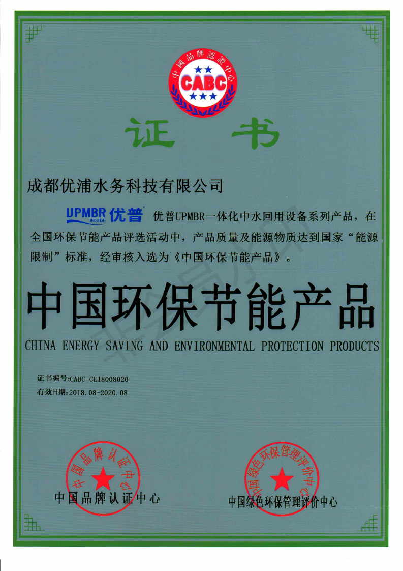2018年8月,成都優(yōu)浦水務(wù)科技有限公司成功獲得中國(guó)綠色環(huán)保管理評(píng)價(jià)中心與中國(guó)品牌認(rèn)證中心聯(lián)合頒發(fā)的“中國(guó)環(huán)保節(jié)能產(chǎn)品證書(shū)”。 優(yōu)普UPMBR一體化中水回用設(shè)備系列產(chǎn)品,在全國(guó)環(huán)保節(jié)能產(chǎn)品評(píng)選活動(dòng)中,經(jīng)專(zhuān)家評(píng)定,符合綠色、節(jié)能的要求、產(chǎn)品質(zhì)量及能源物質(zhì)達(dá)到國(guó)家“能源限制”標(biāo)準(zhǔn),現(xiàn)已獲得綠色建筑節(jié)能推薦產(chǎn)品證書(shū)。 中國(guó)環(huán)保節(jié)能產(chǎn)品證書(shū)的獲得,意味著優(yōu)普的技術(shù)研發(fā)能力已經(jīng)邁向更高臺(tái)階。優(yōu)普服務(wù)于國(guó)家戰(zhàn)略,以節(jié)約資源、保護(hù)環(huán)境、建設(shè)綠水青山為基本原則,為國(guó)內(nèi)的污水處理提供綜合解決方案,為客戶創(chuàng)造更多的價(jià)值。