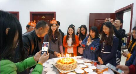 照片:優(yōu)普為當(dāng)月過生日的伙伴舉行慶祝活動 活動結(jié)束后,大家意猶未盡,可惜天公不作美,晚上氣溫驟降十幾度,光霧山的美景只有留待明天游覽了。 第二天起床,環(huán)顧四周半腰以上的山區(qū)已是白雪籠罩,氣溫低過了五度,可是再冷冽的空氣,也無法阻擋優(yōu)普人的熱情,在董事長詹偉的帶領(lǐng)下,我們沒有一個人掉隊,依然向著景區(qū)目的地出發(fā)了。