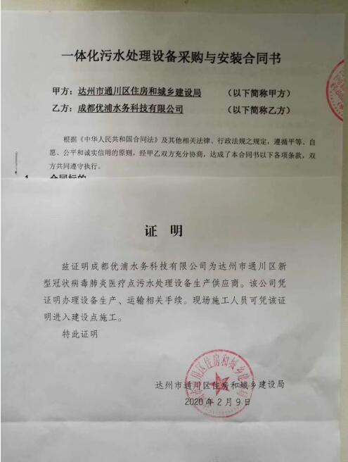 2月9日,因疫情防控需要,達州市通川區住房和城鄉建設局緊急指定優普為達州市通川區新型冠狀病毒肺炎醫療點污水處理設備生產供應商,目前已經妥當組織好設備生產和安裝、調試計劃。