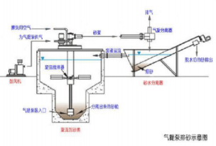 旋流沉砂池結構簡介 (6)自吸砂泵排砂示意圖 自吸砂泵, 是葉輪砂泵, 裝置在旋流沉砂池的頂部,間歇地將砂從池底部抽出來,將砂漿提升至砂水分離器。